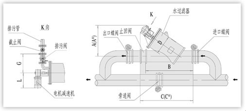 型號(hào) 管徑 (mm) 過濾流量 (m3/h) 過濾面積 (cm3) 排污閥DN (mm) 一次清洗 水量(L) 電機(jī)功率 (KW) 重量 (Kg) D (mm) A (mm) A (mm) B (mm) C (mm) C (mm) L (mm) G (mm)