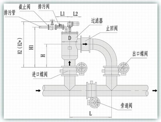 型號(hào) 管徑 (mm) 過濾 流量 (m3/h) 過濾 面積 (cm2) 排污 閥DN (mm) 一次清 洗水量 (L) 電機(jī) 功率 (KW) 重量 (Kg) D (mm) H (mm) H1 (mm) H2 (mm) H2 (mm) L1 (mm) L2 (mm) L (mm)