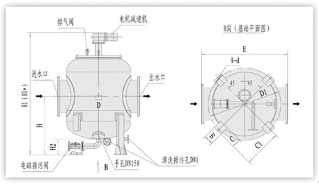 型號(hào) 管徑 mm 過濾 流量 m3/h 過濾面積 cm2 電磁排污閥DN1 mm 一次清洗水量L 清洗排污閥DN1 mm 電機(jī)功率 KW 重量 Kg D mm H mm H1 mm H1 mm H2 mm E mm D1 mm B mm C mm C1 mm D mm