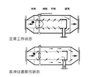 手 動蝶閥關(guān)閉,即閥板平面與筒體軸線垂直,(此時扳手旋轉(zhuǎn)90度與筒體軸線垂直),開啟排污閥,此時水流從進口進入過濾網(wǎng)筒前端,因蝶閥關(guān)閉,水流被閥板擋住,只能從前端網(wǎng)孔進入濾筒外側(cè),大部分從出口流出,而由于排污口打開,濾筒后段水排出后壓力降低,故一部分水又從過濾器后段的網(wǎng)孔反沖入網(wǎng)筒內(nèi),從而達 到從濾網(wǎng)外部沖洗粘附在網(wǎng)筒內(nèi)壁上雜質(zhì)的目的,雜質(zhì)及污水從排污口排出。